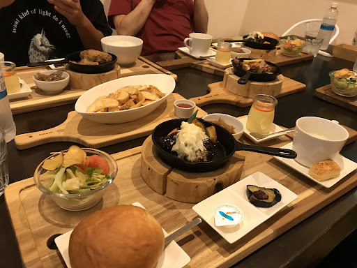 トレーにサラダ、スープ、ご飯、ハンバーグの乗ったスキレット、小鉢、二連小皿に入った漬物・辛みそ、デザートのプリンが全部乗ってます。 先にサラダとスープくらい持って来てもらえるとハンバーグが焼けるまでの時間も有効につぶせるのですが、これだと先にサラダやスープをゆっくり味わってる間にせっかくのハンバーグが冷めてしまいます。 美味しく食べてもらう工夫より、インスタ映えと一度で料理の給仕が完了する楽さを優先したものだと考えられます。