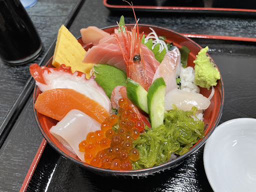 人気NO.1の海鮮丼。 めかぶ、マグロ、イクラ、イカ、サーモン、 甘エビ、タコ、卵焼き、鯛、きゅうり、 ガリが乗っとって華やかな見た目。