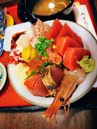 Read more土曜日の13:30に伺いました。 店内は空いており、他に一組のお客さんがいるくらいでした。 時価にドキドキしながら、若い女性店員さんに海鮮丼定食とウニ丼定食を注文。 店内の阿部首相が来店した時の写真なんかを見ながら、定食が運ばれてくるまでを過ごしました。 どのネタも美味しい海鮮丼と、鮮度のいいモリモリのウニ丼に感激しながら頂きました。割烹料理のお店だけあって、お味噌汁や茶碗蒸しも美味しかったです。お会計は2人で4950円。満足です。