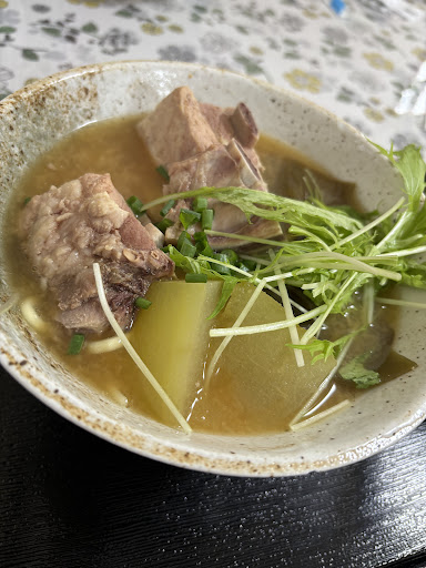 が、しかし旅先のご飯はかけがえのないもの! 冒険して失敗はしたくないのでソーキソバをオーダーwきっと山羊汁も美味しいんでしょうけどね! こちらのソーキソバは900円と少々値段設定が高め。着丼するとその理由にも納得のソーキの量感!大きめの骨付き肉が3つ。 かなり存在感あります。そこに珍しかったのが大根と昆布も入っていました。 スープの味は、他のお店と違い味噌仕立て?美味しいです。がいわゆる沖縄そば・宮古そばをイメージしてると期待ハズレになるかもしれま...