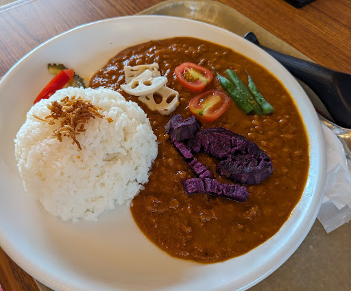 ビビットな色合いが特徴的な、沖縄野菜をタップリ使ったカレーは、オリジナルの本格ルーとよくマッチ🍛 ヒコーキ形のカマボコがのった沖縄ソバは、カツオ出汁がよく効いたサッパリ味でウマい🍜