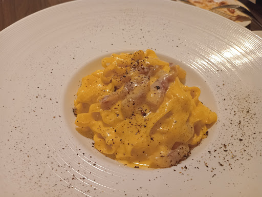 Food The two pasta’s did not arrive at the same time. The Vongole was pretty good. Slight pepper taste, plenty of clams and nice al dente pasta. A possible 4. The carbonara however, was overcooked, fatty, more cream taste (which is a no no) than cheese and only a bacon piece on top as decoration. Not a single piece of bacon in the carbonara itself.