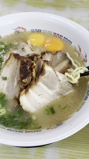 Read more子供の頃から通ってて舌に刻まれてるので私の中では唯一無二の最高ラーメン。こってりだけど豚骨くささはあまり無いかも。バランス最高。旨味濃厚。肉油か塩かニンニクかコショウかそれらの複合的作用なのかかなり甘く感じる不思議な味。醤油ラーメンにすると若干あっさりめだけど甘さが強くなる。九州醤油は超甘いからか。私は好みです。黄色のちぢれ麺がスープに合う。 私の舌はここがベストの基準になってしまってるので近い味を求めてさまよってしまう。鹿児島ラーメンだとちょっとあっさり感じてしまうし、北九州では一蘭に通ってたけどもっと甘さを求めてしまい、久留米・博多系はそこまで求めてないトンコツくささが気になってしまう。 替え玉無いので最初に大を頼むしかない。ギョーザは小さめ一口サイズで食べやすい。 テーブル(座敷)x8、カウンター席x5?くらい。土日はだいたい混んでる。駐車場空きができるまで路肩で待つ車があったりする。平日はすいてる確率まぁまぁ。 少し系統近い味...