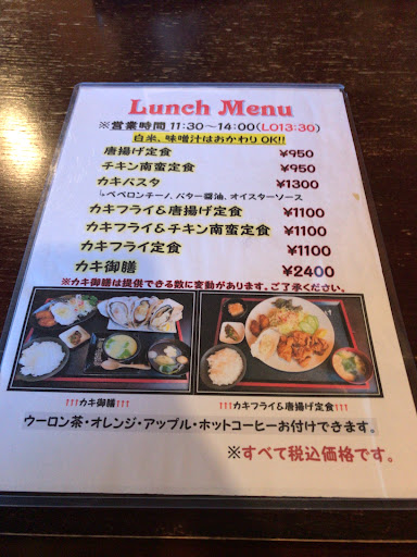 ランチメニュー ・唐揚げ定食 900円 ・チキン南蛮定食 900円 ・カキパスタ 1,200円 (ペペロンチーノ、バター醤油、オイスターソース) ・カキフライ 唐揚げ定食 980円 ・カキフライ チキン南蛮定食 980円 ・カキフライ定食 980円 ・カキ御膳 ...