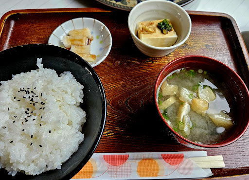 お盆にご飯、味噌汁、豆腐と漬物、そして別のプレートでハンバーグです ハンバーグは薄くて圧し広げてる感じでトマトベースのソースが掛かっています 全般的には普通って感じでした 家庭料理というイメージです