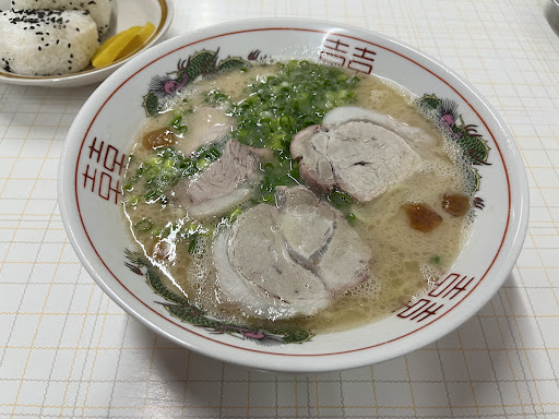 見た目はザ・頑固親父!な店主さんがやってる、古き良き昭和な雰囲気のあるお店。小ぢんまりとした店内は豚骨の香りが漂い、食欲をそそります。 メニューを見ると、替え玉の文字が見当たらないので「替え玉はありますか?」と尋ねましたら、「それは後からできた方式で、長浜ラーメンのやり方だねぇ。うちは本物の久留米ラーメンだから、スープを飲ませる!だから替え玉はないんだよ~」と教えてくださいました。 ならば!と大盛りラーメンを注文。 スープは最初『ん?薄い?』と思うくらいのアッサリなんですが、二口、三口すすっていく内にアッサリの中にもコクが感じられ、どんどんと飲んでしまいます。 麺は中太のかん水を使った麺で、同じ太目の麺でも鹿児島ラーメンともまた違っていて、自分はかなり好みでした。 気付けば完飲完食!スープは必ず残す派の娘も完飲していました。 また追加で頼んだ豚足は丁寧に毛抜きされていて、表面の焦げ目が香ばしくてとても美味でした!味は塩コショウかポン酢のどちらかを選べます。 店主さんは少しお耳が遠いそうで、聞き間違えると「ゴメンねぇ~」とちょっと微笑むのがまた何とも言えず雰囲気があって良いのですが、注文する時は声を張って...