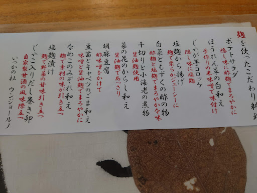 Read moreピザランチ税込1100円をいただきました♪ ハーフのピザが6種類の中から選べて、おかずの盛り合わせ13品、サラダ、ドリンク、デザートがついてこの値段は安すぎます! 麹や自家製のお味噌を使ったヘルシーで、体に優しいお味でした。 ピザの生地はパリパリで、お野菜の具もたっぷりで美味しかったです♪ ドリンクはホット、アイス、ジュースと種類がたくさんありました。 デザートは食べられるかなと思いましたが、2種類のケーキとゼリーは甘すぎず、大きさもちょうど良く、ペロッといけちゃいました! 甘酒のサービスもあります。 お腹いっぱいになりますが、ヘルシーなので、罪悪感がなく、大満足でした!!! ピザやお料理のお持ち帰りもあるので、今度ぜひそちらも...