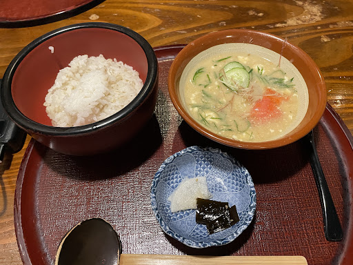 Read more次の名物を探している時に 冷や汁を食べたいという話になり、目指していたお店の途中にあったのはこちら。 ぞうすいの店 お通 本店 さん。 目指していたお店にむかう途中でこの外観とぞうすいの店というところに惹かれてこちらのお店に入りました。 ぞうすいの店という事でしたが、 餅料理、だし茶漬け、冷や汁、クリームぞうすい、しじみ汁、雑炊、逸品物のおつまみなど、多くのメニューがありました。 汁系統が多いので今回みたいに2件目でもよさそうな感じです! 頼んだのは、 めんたいの冷や汁。 一緒に行った方が冷や汁を頼まれていたので、自分へめんたいにしてみました。 温かい麦飯に冷たい冷や汁(きゅうりのスライス、茗荷、大葉、めんたいこなどが入っている。)をかけて、いただきます。 さっぱりしているので、これからの暑い日には食べたくなりそうです。 個人的には麦飯が冷たかったらもっとサラサラいけそうで、好みになりそうかなと思いま...