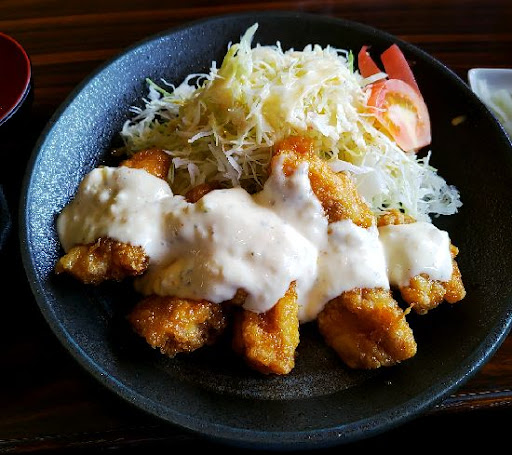 日曜12時回った頃でしたが、先客がいただろう形跡が残ってるだけでモスと繋がってはいるもののどうやら客は自分達のみ。迷いなく「名物チキン南蛮」(税込1200円)を2つ注文。 連れはもも肉&うどん 自分はムネ肉&みそ汁 カウンター席向こうの厨房からは揚げてる音がいい感じに聞こえてきます。そうこうしていると次から次と来客多数あり。しかも県外ナンバーの車が…(自分も笑)やはり人気店です。 待つこと10〜15分程度でしょうか厨房から着皿、すぐ後にご飯とお汁(うどん)が運ばれてきました♪美味しそう‼︎ 見た目でレディースにしなくてよかった!と思いました、食べ切れる笑 ムネ肉は十分柔らかくジューシーでした。 一口もらったモモ肉はさらに柔らかくとろけそうでした。
