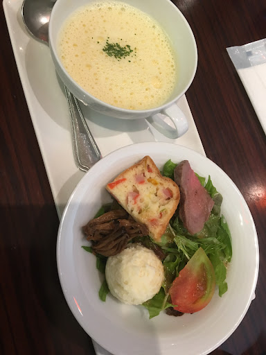 Read more白身魚のセット(約1300円)+ケーキバイキング(約750円) お魚は身がふわふわで塩加減もちょうどよく 美味しかったです! サラダは中身はシンプルな野菜、 パンも普通でしたが、 宮崎ランチで特に高級食材とゆうわけでもなくこの値段だとけして安くはないですが ここの立地や雰囲気を考えるとこんなものなのでしょうか。 友人の食べていたチキン南蛮は固かったようですが。(タルタルは余るほど多め) ケーキの方は一口サイズとゆうか ミニミニサイズくらいのが10種類程? その他カヌレやマカロンタルト・・・ ドーナツだけが他より少し大きめ。 タルトは100均カップ生地にクリームが ちょんと乗ってるくらいだったり サイズが小さすぎるのと種類も少なすぎて これで約750円はお高すぎます。 1回お皿に取れば2回目はないです。 ケーキバイキングのみなら1000円らしいですが このクオリティでその値段設定は衝撃です。。 ランチと合わせて2000円・・・ それだけ出すならデザートつけても 他でもっと良いものが食べられますね。 男性スタッフの方の愛想がよく 気が...