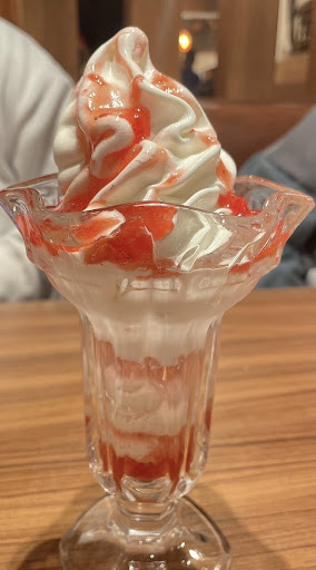 ハンバーグはいわゆる「成形肉」タイプの柔らかめのハンバーグで可もなく不可もなく、トッピングの組み合わせも可能なので楽しめる。デザートパフェ8種、ドリンク15種以上ありカフェとしてもありな感じ。