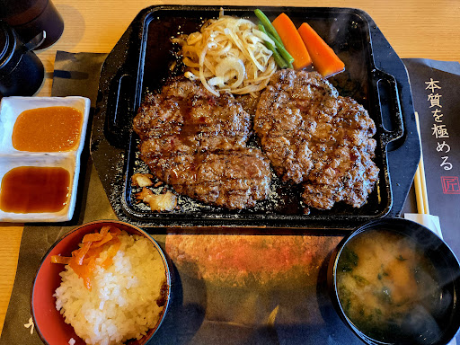 Read more久しぶりの平家の郷、こちらの店舗は初めて行きましたが、大盛うどんと同敷地内の建物も繋がっているので入口注意です 12時ちょうどでしたが空いていたのですぐ座席に案内してもらえました その後からは次々とお客さんが入ってきて店内がいっぱいになったので早めにきて良かったです 隣の人の鉄板が来る度に空調に乗って油が来るので、早くエプロンくださーーーいって心の中で叫んでました(笑) つけるタイプのソースが、醤油ベースと日向夏ベースの2種類、塩、胡椒が置いてあり ご飯と一緒に漬物の壺も来ました 油飛びすぎるけど、それもアミューズメント感として捉えれば楽しいです ご飯は少なめなので女の人には助かるのでは もちろん、少ない分おかわり自由なので無問題 お味噌汁もあおさ多めで美味しかったです お肉は言うことなし ハンバーグとステーキがどちらも楽しめるセットにして、一番安いカットステーキのオーダーでしたが、お肉が柔らかくて旨みもしっかりあって、塩で食べると最高に美味しかったです 私はニンニク苦手で、お肉がにんにくスライスに乗ってくるので、早目に避けました ハンバーグのお肉は「牛」!!ステーキよりも牛を感じました ソースはどちらでも合います ご飯が進んで恐ろしいです