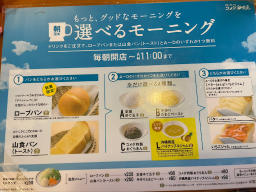 モーニングは11時までの入店に限り提供される。ゆで卵、卵ペースト、おぐらあんのどれかと、トースト1/2がついてくる。