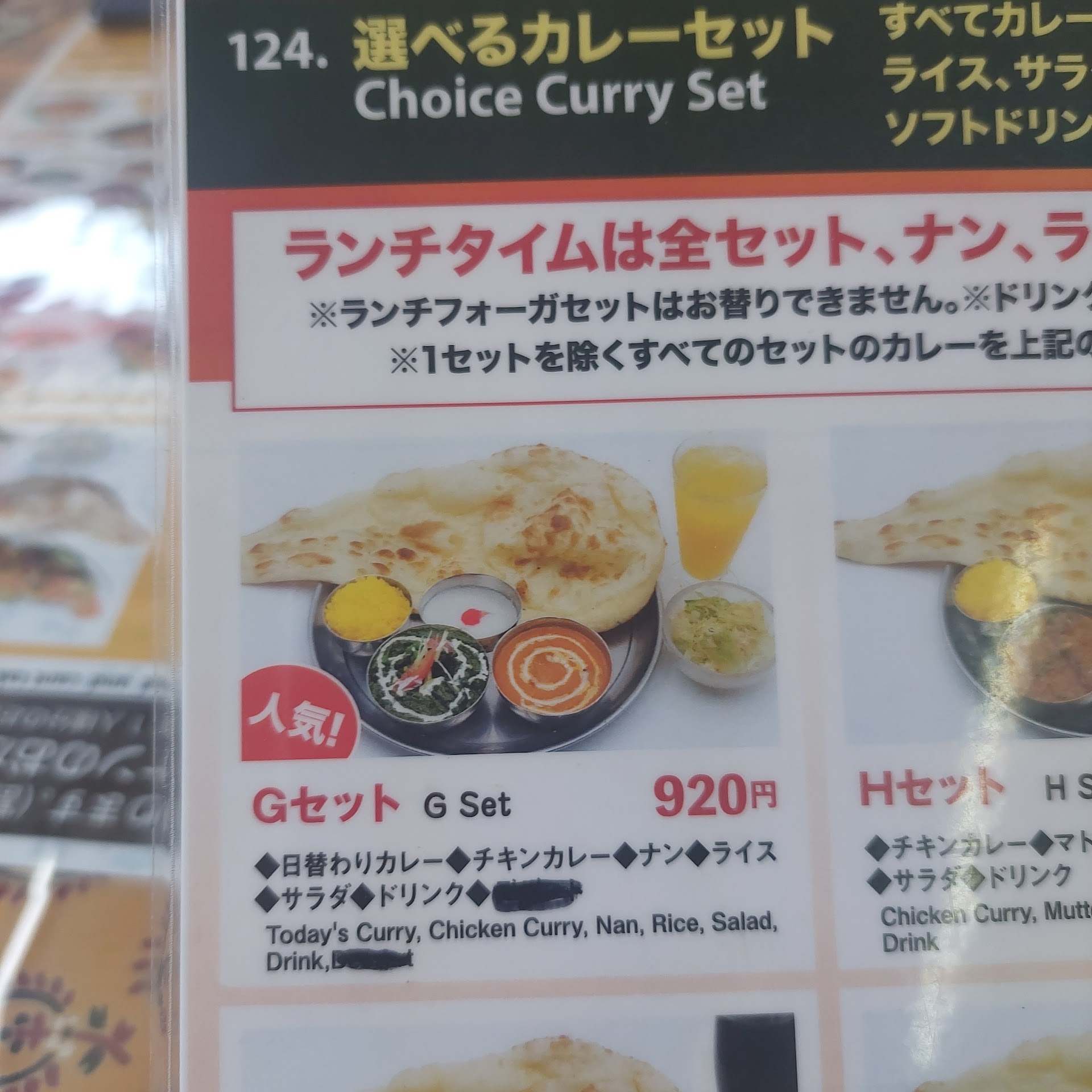 “Gセット(3辛)”を注文。 ナン、でかーーーーー この日の日替わりカレーは豚肉のなんちゃら。 辛いの好きな私ですが、3辛でも中々の辛さ。2種、違うカレーのはず…味があまり変わらない。食べるにつれ塩辛い。 ご飯に色は付いてるけど味はしない。