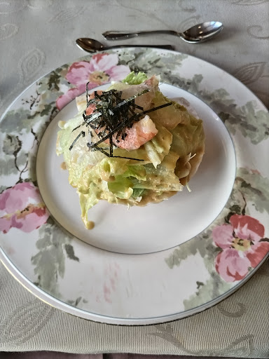 レトロランチを注文。 内容は、お刺身サラダ、カボチャのポタージュ、デミのハンバーグ(上にビーフシチューのビーフ?が乗っています)、ライスorパン、デザート(ババロア)、食後のドリンクのセットです。 似たメニューで、みやざきひなたランチ2,200円がありますが、こちらはレトロランチと内容はほぼ同じで、ハンバーグのソースがデミ、トマト、てりやきの3種類から選べ、デザートがババロアにプラスでもう一品つく感じです。