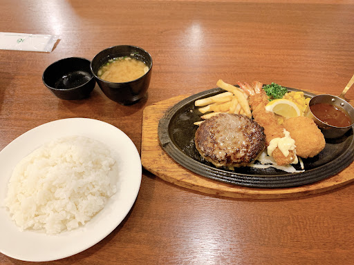 海老フライと紅ズワイ蟹のクリームコロッケが付いているハンバーグにしました。 味噌汁がなきゃ米食べたくないばりに味噌汁が好きなので、セットはありませんでしたがそれぞれ付けました。 タルタルが少なすぎないか?とも思いましたが、ソースが丁度よく余ったので事足ります。 ハンバーグはかなりの音を立てて鉄板の上にいたので猫舌な僕は適当にポテトを摘んでました。 蟹クリームコロッケも箸でしっかり割れます。ハンバーグはちょっと硬さを感じましたが肉厚で美味しいです。