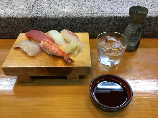カウンターで、焼酎のロックと、鮎の塩焼きを注文しました。発車時刻まで30弱しかないのでゆっくりはできません。時間がないので、握り寿司を適当に5巻握ってもらいました。 写真上左から、マグロ、モンゴウイカ、真鯛、カンパチ、海老です。 小腹が空いていたので、ちょうど感じにいただきました。 (o^^o)