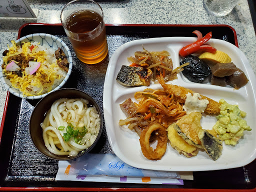 先日新聞に掲載されていたのを見て5人で伺いました。 内装はスナックの様で、カウンターにお料理が並び、席は4人描けテーブル4つ。 肝心なお料理は…沢山でびっくり! きんぴらや煮物類、塩焼鯖やだし巻き ハンバーグにエビフライ、天ぷら類、うどんとそば、カレー等々… 子供からお年寄りまで楽しめるお惣菜がずらり並んでます。 丹後寿司もあります。 プチデザートケーキとオレンジもあり、ミネラルウォーター、ウーロン茶 オレンジ、リンゴジュース、コーヒーも飲み放題。 これで、大人税込1000円! 小学生700円幼児500円! 因みにお弁当パックに500円~でお持ち帰りも出来るそうです。 どれも美味しく頂きました。 ご馳走さまでした。