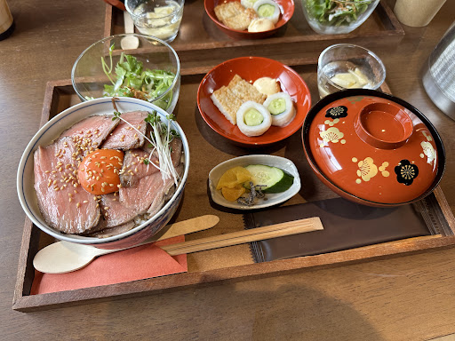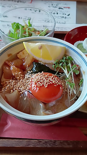 Read more傘松公園へ向かう前にランチをするため寄りました。 傘松公園へと向かうケーブルカー乗り場前、お土産屋さんなどが数件並ぶ細い路地にあります。 2023年4月頃にオープンしたばかりのようで、店内は古民家のような雰囲気に和の装飾がお洒落な感じ。 金曜日のお昼12時頃でしたが、店内にはまだ誰もおらず、お好きな席へどうぞと案内されました。 メニューは、海鮮漬け丼とローストビーフ丼と黒毛和牛スジカレーの3種類のみ。折角海近くに来てるので、漬け丼を注文。 口コミではワンオペなので時間がかかると書かれていましたが、他のお客さんがいなかったこともあり、15分ほどで運ばれてきました。 白身の魚の漬けには濃い色の黄身が乗っていて、見た目は美味しそう。他に、サラダとお吸い物と小鉢とフルーツ付き。 まずは「しょう油とお出汁のすっきりとした味わい」と書かれていた漬け魚をそのまま食べてみましたが、んー普通。身は厚めで食べごたえはありますが、すっかりし過ぎというか魚の旨味はあまり感じないかな。 添えてあったレモンを絞ろうかと思ったら、パサパサで全く果汁は出てこない有り様。 その後は黄身をからめて食べ、最後は出汁をかけて出汁茶漬けに。テーブルに置かれていたぶぶあられをかけると、サクサクとした食感がアクセントになり面白い。 お吸い物は市販のものなうえ、ぬるい。 水菜のサラダは2口くらいの量だし、フルーツのりんごもとても小さくカットされて2口程度。これで¥2,000弱はコスパ良くはないかな。 内装の和の感じといい、外国人観光客向けなのかな~と感じてしまいました。 テイクアウトの方に力を入れているようで、店頭では映えそうなメニューがありました。 店員のお姉さんは感じの良い方でし...