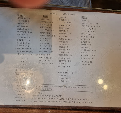 The food and the service were great, as were the prices. The ladies look after the customer service side of things, including the crowd management. If you turn up and it's busy then you can expect to be bustled outside (a bit unceremoniously) so you can add your name to the waiting list. Personally I think this shows some of the great character of the staff. It's neither offensive nor aimed at tourists. Others (locals) turned up after us and we're treated in exactly the same way but without the language issue. The restaurant is right across the road from Miyazu station. Service was quick and there was a great buzz in the place as the locals went about their evening"s entertainment and enjoyment. We went back for a second night and were recognised and welcomed. We have Google translate on our phones so with mobile data access we could interpret the menu. We stayed with familiar stuff and the sashimi, ebi tempura and the grilled chicken were all very tasty. The menu is attached. Run it through Google...