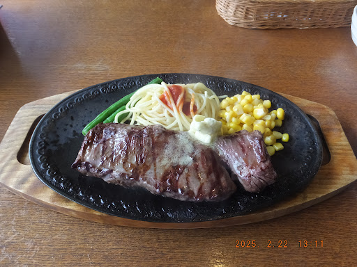 ひとつここで驚きの体験をしたのだが、それは私は食べるのが遅いため途中まで食べたら鉄板の温度が下がり、お肉の温度がぬるくなった。熱い状態で食べたかったので鉄板のあたため直しをお願いしたら、快く了承していただき、厨房の方に持っていって、その後五分ぐらいしたら持ってきてくれたのだ、その鉄板を見てとても驚いた。それは何故かと言うと、私がもう食べたはずの付け合せなどがまた盛り付けてあったからだ。盛り合わせにはパスタとインゲン、コーンとお肉の上にはレモンとサワークリーム?みたいなやつがあったのだがそれが全てまた付け合せで復活していたのだ、このようなサービスは人生で初めて受けたのでとても感銘を受けた...