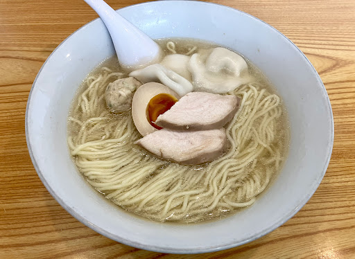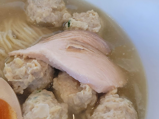 出てきた見た目はちょっと拍子抜け。 具が味玉半分に、鶏チャーシュー1枚、鶏つみれ9個のみ。 ワンタンとかトッピングすればよかったなーと悔やみつつスープを。 スープは清湯と鶏白湯の間ぐらいの色。