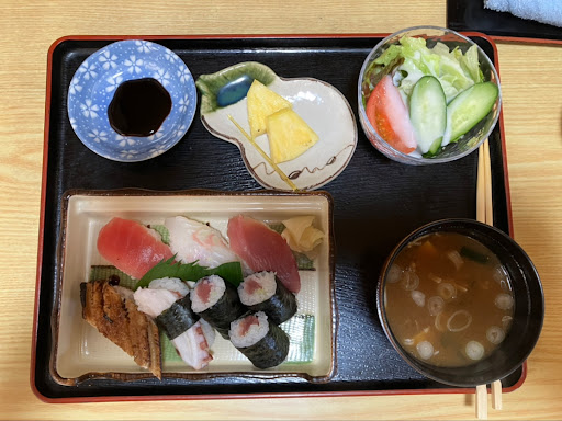 以前からあるのは知っていたので、一度寄ってみたいなと思い、お昼のランチで東寿司さんに立ち寄らせてもらいました。グーグルマップではまるさ水産の並びに東寿司さんがあり目立ちません。東寿司さんのお店の口コミを見てみると、他の方の写真の中に、明らかに隣のまるさ水産の写真も紛れ込んでますので間違った情報も入ってますね😅。店内そこまで広くないです。駐車場は2台が限界かな?。駐車場は入りにくく出にくい感じですね。狭いです。幸いにもみよしのイオンモールが近いので、買い物がてらそこに停めて歩いてくるのもありかもですね😄。 お店に入ると誰も居ない😅。声を掛けたら出てきてくれました。営業してるようですが、私一人しかいませんでした😅。貸切状態の中、注文する事に。 お寿司のランチを、注文する事にしましたが、とてもリーズナブルなお値段😁。江戸前寿司をこの値段で食べれるならいいですね。今回は880円の寿司ランチでうどんをチョイス。カウンターに座り、目の前で泳いでいる海老を観賞しながら待ちます。私の為に大将が目の前で握ってくれます☺️。有難いことですね😄。10分位で寿司ランチ出て来ました。見た感じの量としては腹八分目な量ですね。女性ならお腹一杯になるのでは。 サラダはシャキシャキで野菜の新鮮さを感じられました。うどんは麺はやや柔らかめでコシは感じられませんでしたが、ツルツルしたうどんです。何より、うどんのつゆが旨い👍。お寿司屋さんのうどんは美味しいとは聞きますがここは美味かった。そこいらの変なうどん屋さんより旨いですね。つゆを残そうかと思いましたが結局全て飲み干してしまいました😅。おいしいですね!と言ったら、大将、嬉しそうに、常連客の方もこのつゆが好きでうどんを注文する方がいるとの事。納得です😄。お寿司の方は鉄火は筋もなく美味しく食べれましたね。タコもコリコリしてて美味しかったですし、他のネタも美味しかった😄。回転寿しに慣れてしまっているとわさびを醤油に混ぜて寿司をつけて食べてますが、ここはわさびはネタの下に入ってます😄。お寿司ってこういうもんだと思い出さてくれました。わさびが苦手な人は先にサビ抜きで注文する事をお忘れなく😅。 ただ、お寿司提供されてから、じっと立たれてましたので、少し気まずい時間が流れましたが、大将話好きな様なので行く方いましたら気軽に話しかけて上げてください😄。他にもランチ数種類有るのでまた来てもいいなと思うお店でした。 とても美味しかったです。...