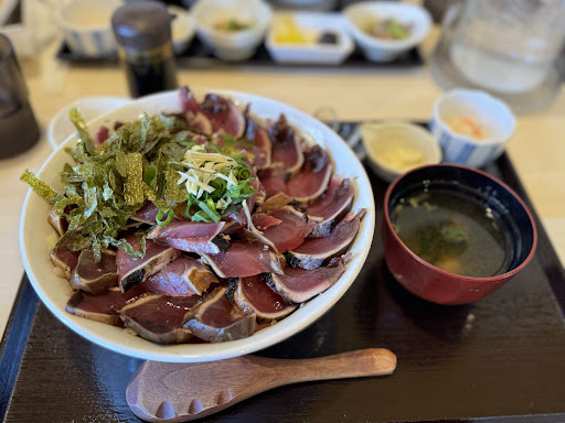 Read more先に書いておきます 当方は高知市内を中心にした高知県で主流のカツオのタタキしか食べておらず室戸市のタタキはこのお店で初めて食べました カツオの藁焼きは良いのですが表面が焦げてしまって苦い味がするのは残念でした 藁焼きしてからのオペレーションも良くないようでほのかに温かいながら藁の香ばしい匂いと 黒潮町産の粗塩で食べる自分の知るタタキとは違い少し残念でした 玉ねぎも量が多くカツオより玉ねぎの味が強く感じられさまざまな調味料で味の調整もしましたが修復不能 お店で酸っぱい匂いも感じたのですが玉ねぎも何かしてるのかと感じるほど酸っぱさを感じました あくまで個人の感想ですが高知で広く食べられてるものでなく室戸地方で食べられてるタイプのようなので土佐の名前は控えて室戸のタタキと言ってた方が良いでしょう お店のスタッフさん達はすごく丁寧で一生懸命やられてて好印象でした 本場を離れるとやはり〜〜風という印象です 藁の香ばしい匂いと外がほんのり温かく優しい味の高知市のカツオのタタ...