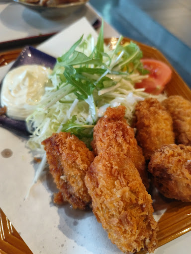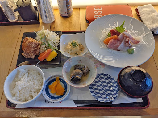 提供は早く4分で膳が運ばれて来ましたよ。結構豪勢ですね、しまったなぁご飯が少な過ぎるわ(´△`) 煮魚が遅れること1分。 さて揚げたての唐揚げから頂きましょうか、1個だけとはいえ大きいですな。皮がカリッとしていて肉汁ジューシーで旨いな。隣の客が若鶏の唐揚げ御膳頼んでいて、(お魚ダイニングでお肉を選ぶなんて・・・)とか思っていたけど、ごめんなさい( •᷄ὤ•᷅) 旨いわw 巻貝の煮付けはバイ貝かな?大きいの1つに可愛いの2つ、海鮮料理屋らしくていいね。酒呑みてぇ(´Д`) 刺身も頂きましょうか5種盛りかな蛸と鮪以外はスゲー脂乗ってる、醤油をはじいちゃうww こりゃ刺身御膳も美味しいんだろうな。冷や奴もあるぞ。こりゃ白飯足らんわ。お代り下さいww メインのメバルちゃんは小振りながらしっかり味染々、( ゚д゚)ンマッ! でも上の白ネギと照明の暗さはなんとかならんか、骨が見えやしねぇww 器が深い上に照明は横からだかんね。しょうがないんで一旦ご飯の上に置いて光を透かしながら骨取ってたよ(笑) 味噌汁も少ないんだけどブリかハマチかな?切り身が入ってて旨かった。