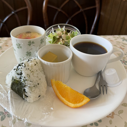 そのおにぎりのモーニングはおにぎり1個のほか、茶碗蒸しにサラダ、デザートにフルーツまで付いています。おにぎりはほかほかご飯にそのご飯の甘みを引き出すほどよい塩気が絶妙ですね。それに茶碗蒸し、モーニングの茶碗蒸しって何気にうれしいんですよね、少しゆるめので優しくもイイ味がする美味しい茶碗蒸しでし...