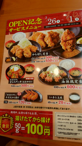 お一人様がランチとして利用する分には良いかと思います。 唐揚げの持ち帰りが出来ますが、主婦の方がわざわざ購入のために立ち寄り食卓に添えるほど美味しいというものでもなく、値段もかなり高めの設定です。 学生がオヤツとして食べるのには向いてるかも知れません。 接客としてのサービスや製品の味は特に文句ありません。特別美味しいというわけでもありませんが…。 私は冷凍食品の唐揚げの方が安上がりで量も期待できるので、そちらを選ぶでしょう。 多分もう行...