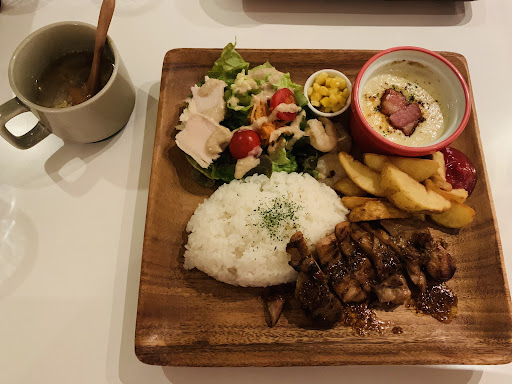 Read moreランチタイムからずれてしまってカフェタイムに行き、グリルドチキンランチを注文しました。セットのドリンクはカフェオレが良かったですが、セットには無かったのでアイスティーにしました。 ガムシロップを付けるか聞かれたのでお願いしたのについていませんでした。ストレートティーも嫌いじゃないので一々言いませんでした、うっかりはあると思いますがそんなに忙しい時間でもなかったと思うので少しガッカリ。 提供まで10分くらいかかったかな?と思います。先にドリンクをもらえるのかと思っていたらドリンクも出てこず、確認もされませんでした。夏場はドリンクだけ先に提供してくれてもいいと思います。 サラダと焼き野菜は味も濃くなく美味しかったです、ポテトはTHE冷凍って感じ、チキンは柔らかくて美味しいですがすごく脂っこく男性が好きそうな味付け。不味いわけではないですが、特別また食べたいとは思いませんでした。ふわふわチキンも食べましたが、無難に美味しいといった印象。 店内はおしゃれですが、目の前が壁のカウンターに通されあまりくつろげませんでした。荷物を置くようなカゴやスペースもありませんし窓もないので閉鎖感がすごいです。他の人が話し続けていたし席が近いのであまり静かとは言えませんが、時間とタイミングによるでしょう。 値段はお手頃なのでまた近くに行った時は行って...