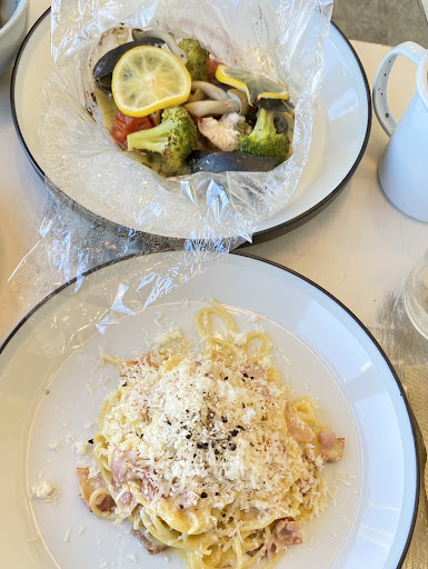 今回は週末限定のランチ利用! パスタは880円、シーフード900円(それぞれ税別で値上げしたかも?9/23)でサラダ、スープ、パン食べ放題付き! メイン料理の量もしっかりあり、スープも美味しかったのでパン食べ放題でこのお値段はお値打ち♪ 美味しくてシンプルなパンに染み込ませながら食べました笑 ただ、パンは選べず店員さんにおまかせ。 軽く焼いてから持ってきてくれました! はじめに4種類持ってきてもらえ、おかわりしても同じ種類(T_T) 甘い系を下さいと伝えるとチョコ系のパンが1種類増えただけで、他の種類も聞くと、合計6種類ほどのパンを食べ放題というところ… ショーケースにたくさんの種類があるので少し残念(><) ちなみに、フルーツが乗ったパイ生地?のパンは対象外みたい(><) モーニングには出てきてたけど、さすがにこのランチお値段では…仕方ない… また、店員さんの人数不足?で料理がくるのもゆっくりめ、パンをお願いしてもゆっくりめ(´-`) 2回目に満席で行ったときはおかわりパンが15分経っても来ず…予定もあったのでごちそうさましました(T_T) ランチのときだけ、自由にパンを持っていけるコーナーがあると店員さんも楽なのでは? スペースやコロナ対策やら難しいのかな(><)