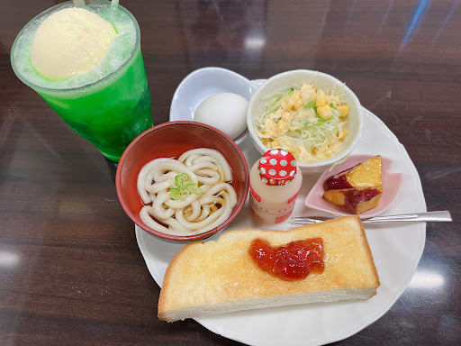 Read more1日モーニングのお店です。 ドリンク代でトースト半切れ・(ジャムの種類選べます)ミニサラダ・ミニうどん・卵・デザート・乳酸菌飲料が付いてきました。 クリームソーダは500円、味も濃くてアイスも大きくて美味しかったです。 まず、モーニングでうどんも見かけませんが、麺類好きなので嬉しかったです。 店内はテレビが付いていて豚のぬいぐるみや...