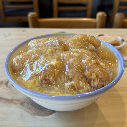 ワタクシのお目当てはかつ丼、ココのかつ丼はとろ〜りとした餡がかかったあんかけのかつ丼、丼一面がたっぷりの餡で覆われています。その餡はイイ出汁が効いた優しくもしっかりした味、かつも結構な大きさでボリュームしっかり、たっぷりの餡がかかっていても衣よカリッとした食感が損なわれていないトコもうれしいですね、それに付け合わせの大根の漬物も何気に美味しかったで...