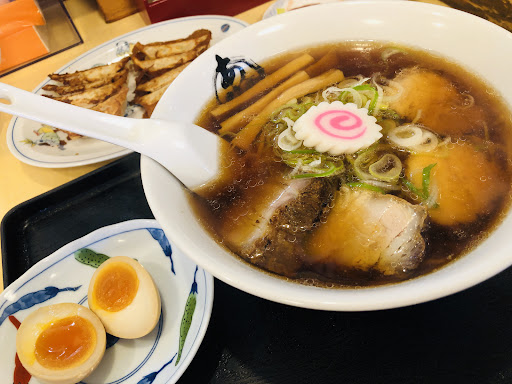 続いてあきんめん。 醤油色のスープに分厚いチャーシュー、真ん中になるとが入った中華そばタイプのビジュアル。