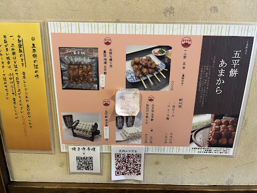 Read more入口近くに窓口があり、中のコンロでは串に刺した白い五平餅(ご飯を粗く潰してまるめたもの3つが1串に刺さっています)を焼いて、タレをつけて、また焼き上げています。 店員さんはとても忙しそうです。 電話の注文も入ります。