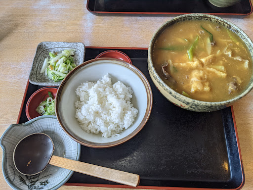 真夏の日中ですが、オーダーはカレーうどんの大盛りとライス。 どれだけメニューを見ても大盛り表記が無いので、大盛りは無いのかな?と思いましたが、聞いてみたら別料金で出来るとのこと。 カレーうどんは大盛りでお願いしました。