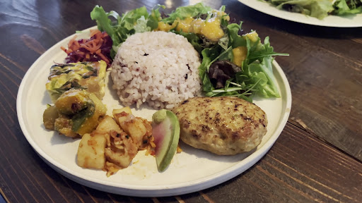 お店はまさに古民家で、靴を脱いで、スリッパに履き替えます。 ランチの種類は3種類で、1100円から1400円程でした。 友人、肉豆腐のランチ、私、煮込みハンバーグランチ どちらもワンプレートです。サラダはぽぽサニーレタスなんですが、ドレッシングがとても美味しく、飽きずに食べられます。煮込みハンバーグもふっくらとして、とても美味しかったです。
