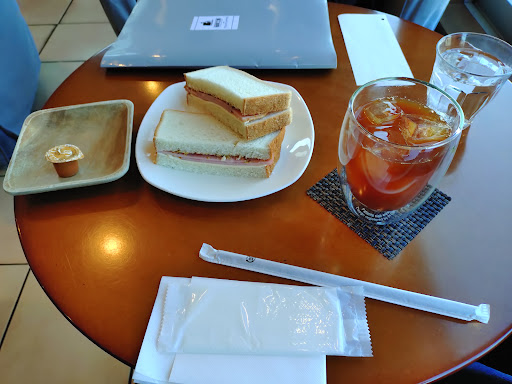 珈琲はフルーティーなアイスコーヒーを注文、小腹が空いたのでハムとチーズのサンドを注文しました。