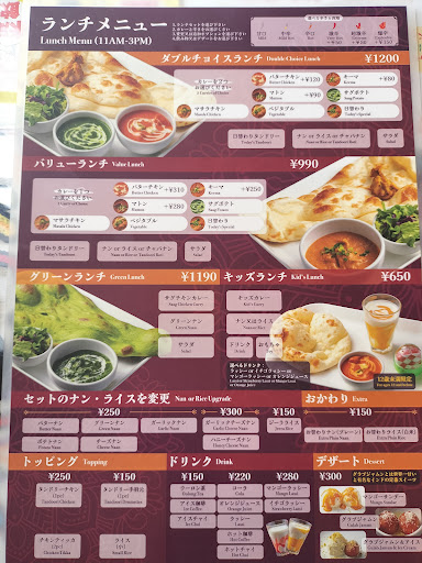 Read moreランチメニューのA・B・Cランチがあり、ちょっとした一品何か違ったりしていて、ナンがライスだったり等あまり大きな違いはありません。 カレーは、日替わりカレーやチキンカレー・マトンカレーなど6種類のカレーから1種類を選択できます。また、無料で甘口・中辛・辛口等など5段階の辛さを注文時にオーダーできます。 ナンは無料で何枚でも追加注文できます。焼きたての美味しいナンてす。しかも、2枚目や3枚目でLサイズは食べきれないと思ったらナンMでとかSでと注文すれば、サイズを小さめにしてもらえるので、残さないで食べられるので安心てす。 またサラダと小さな骨付きチキンが一つ付いて750円でお腹いっぱい食べられます。 160円追加すれば、ランチドリンクも付けられ、コーヒーやチャイなど数種類あります。空腹時の昼食には最高です。 ランチタイムは、11:00~15:00位までだったと思います。 その他ランチメニュー以外にも、色々なカレーやドライカレーやテイクアウトのお...