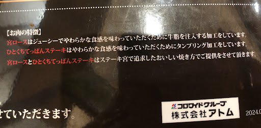 なんか腑に落ちなくて伝票を見返しましたが、注文はロースで通ってる。店員さんを呼んで『ロースを頼んだんだけどハンバーグみたいですね』と聞いてみると、『メニューにも書いてあるんですが、加工肉なのでハンバーグ風かもしれません…』と、なぜか申し訳なさそうな様子。 メニューをひっくり返して探してみたら、裏側に小さく書いてありました。 ステーキと名のつく店に入って、模造肉とか加工肉かどうかなんて調べないと思います。 でも値段はそれなりだし、これじゃ割高感が否めない。 ティラミスも昔、別のステーキ宮に行った時にカップに入った生ティラミスが断然美味しかった。出てきたのはたぶん冷凍ケーキかな? サラダバーは良かったです。