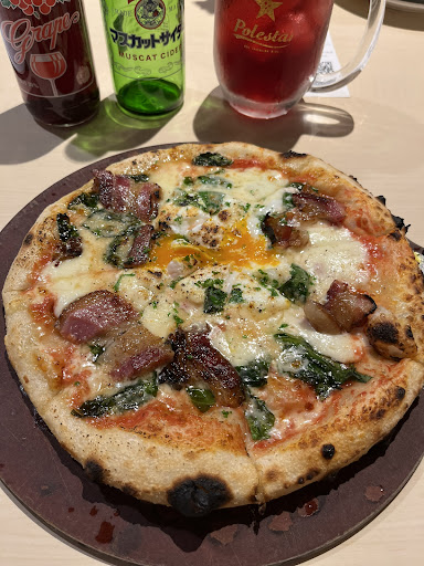 ビスマルクビッツアは、トマトソースにベーコンとほうれん草 「ベーコンはプラチナポークなんですよ」とテンション高めのお兄さん(店長さん?)がピザをカットしながら教えてくれました