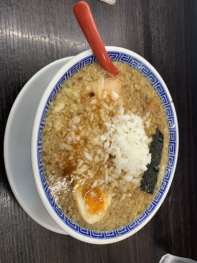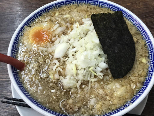 他で発祥したラーメンらしいことは店内にも書いてあるが、こういうの初めて食べた。 率直に言って、とても美味しい。 玉ねぎとにんにくがドバッと入っているので(にんにく抜きにするか聞かれる)、スープは場所によってぬるいのが残念ではある。 たまご麺の中太ちぢれ麺で香りも味もいいので、今後、その点が改善されればいいな。 1センチ角くらいのメンマが3本、厚切りチャーシューが2枚ほど、味玉半分入って700円しないのは嬉しい。海苔はあ...