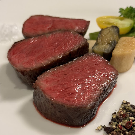 そしてステーキ、お肉は地元岩手の黒毛和牛「いわて門崎丑」の熟成肉、どこの部位かは分からなかったですがとにかく美味いので問題なし、見事にレアに焼き上げられたお肉はジューシーで赤身らしいお肉の甘み、旨みが存分に楽しめます。130gでもボリューム的にはそれ以上に感じられますね。シメのガーリックライスもすごく美味しかったですね。目の前で焼いてくれる臨場感こそないものの、リーズナブルで味もボリュームもしっかりのかなり満足度の高いコースでし...