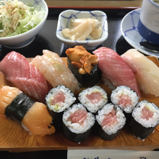 お寿司屋さんです。 ランチで伺いました。 駐車場はお店の前になってます。 2〜3台しかとめれないので少し狭いです。 カウンター席と、テーブル席があります。 テーブルは3席ありました。 ランチは、握りかちらし寿司のセットがいずれも1000円ちょうどで食べれます。 どちらのセットも、サラダと茶碗蒸しとあら汁がつきます。 1000円で比較的に安価に海鮮をいただくことができますし、満腹になれます。 やっぱりお寿司屋さんのお米は、酢がきいていてシャリが美味しく感じました。 もちろん、海鮮も美味しかったです。 茶碗蒸しも、だしがきいていて、最後まで温かく美味しかったです。 あら汁は、海老がはいっていて、海老のだしがきいていてどれも満足でした。 ランチが安かったのでまた利用したいと感じました。 お金があれば夜の回らない寿司も...
