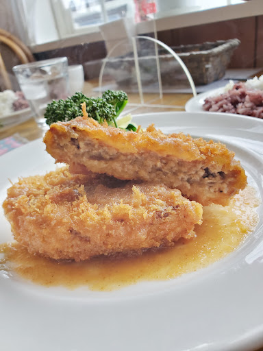 Read more2023.2 爽やかなライトブルーの外観が目をひく 地産地消レストラン「Lachs(ラックス)」でランチを頂きました。 「やまと豚のチーズミルフィーユカツ」 「もりおか短角牛のメンチカツ」と 「チキンのアーモンド和風ソース」を注文。