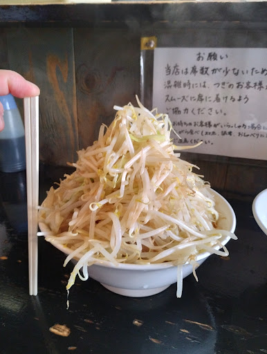 Read more路肩に車を停めて駐車場ないのかなとうろうろ。お店の入り口に案内がありましたので、そちらに向かいます。 お店に入りましたら食券買います。メニューは貼ってるんですが、写真などとリンクしている訳ではないので、初めてだとチンプンカンプン(・・? スタンダードと思われるメニューを整理すると ・醤油・味噌・塩がある ・それぞれに並と大盛がある ・さらにⅠ型・Ⅱ型がある 良くわからなかったので、醤油(並)Ⅰ型の番号を押し食券を買いました。あとで口コミなどで調べたらⅠ型・Ⅱ型は背油の量で、Ⅱ型は多めなのだそうです。もしかしたら書いてたのかも知れません。 他にも ・ポンズラーメン ・梅ラーメン ・煮干しラーメン などがあり、さらに女性向けのSサイズがあったりと、種類豊富なメニューでした。追加のトッピングメニューもありました。 店内はカウンター席だけで10席ぐらい、席が空くのを待つ用のベンチなどもありました。お邪魔したのは昼前の11時半ごろで、運よく待たずに着席出来ました。 食券を出すと「ニンニク入れますか?」と聞かれたので、迷わずお願いします。 ここでとお願いすると野菜増しにしてもらえるよう(野菜増し増しはトッピングメニューにあり)で、常連さんだと「野菜増し・ニンニクありで」と言うみたいです。 5分ほど待ったでしょうか出来上がってきました、結構なボリュームです。 スープは濃厚、麺は自家製麺との事でかなりの太麺。ニンニクがっつりでしっかり食べごたえのあるの一杯でした。 レンゲやティッシュやつまようじはお冷のところに置いてあり、完全セルフ。お冷のコップの上にレンゲを置いて待つのが通みたい。