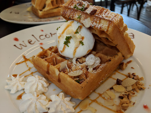 Read moreおしゃれなカフェ。二階は学習塾になっています。お値段はかなり高めです。ワッフルが売りで、皿には様々な文字を書いてくれます。たまにて似つくのが難点ですが、とても楽しいサービスだと思います。 ワッフルの味の方ですが、軽く、あまり油気のないものでした。載っている軽いジェラートとは合うとおもいますが、カリッと焼き上がったものやベルギー系ワッフルを想像している方には合わないかもしれません。 コーヒーはプレスです。熱く、薄味で量がカップ半分ほどまでと非常に少なく感じました。