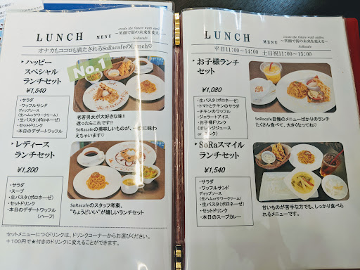 SoRa Cafe has a clean, slick, and modern interior with a staircase leading up to perhaps a cram school on the second. There are outdoor tables and seats available plus a slightly dodgy-looking hammock. Free WiFi is available, just look up by the counter for the sign. The menu is definitely on the expensive side. The lunch menu seems to have a lot of volume but because they only serve pasta with meat sauce all the lunch menu items are off the table for vegetarians. The waffles are nothing to rave about. They look good in pictures, nearly arranged with messages written in chocolate in the plate, but the taste is flat. If you have any of the waffles, I suggest the maple butter one just for the butter (you can hardly taste the sauce on...